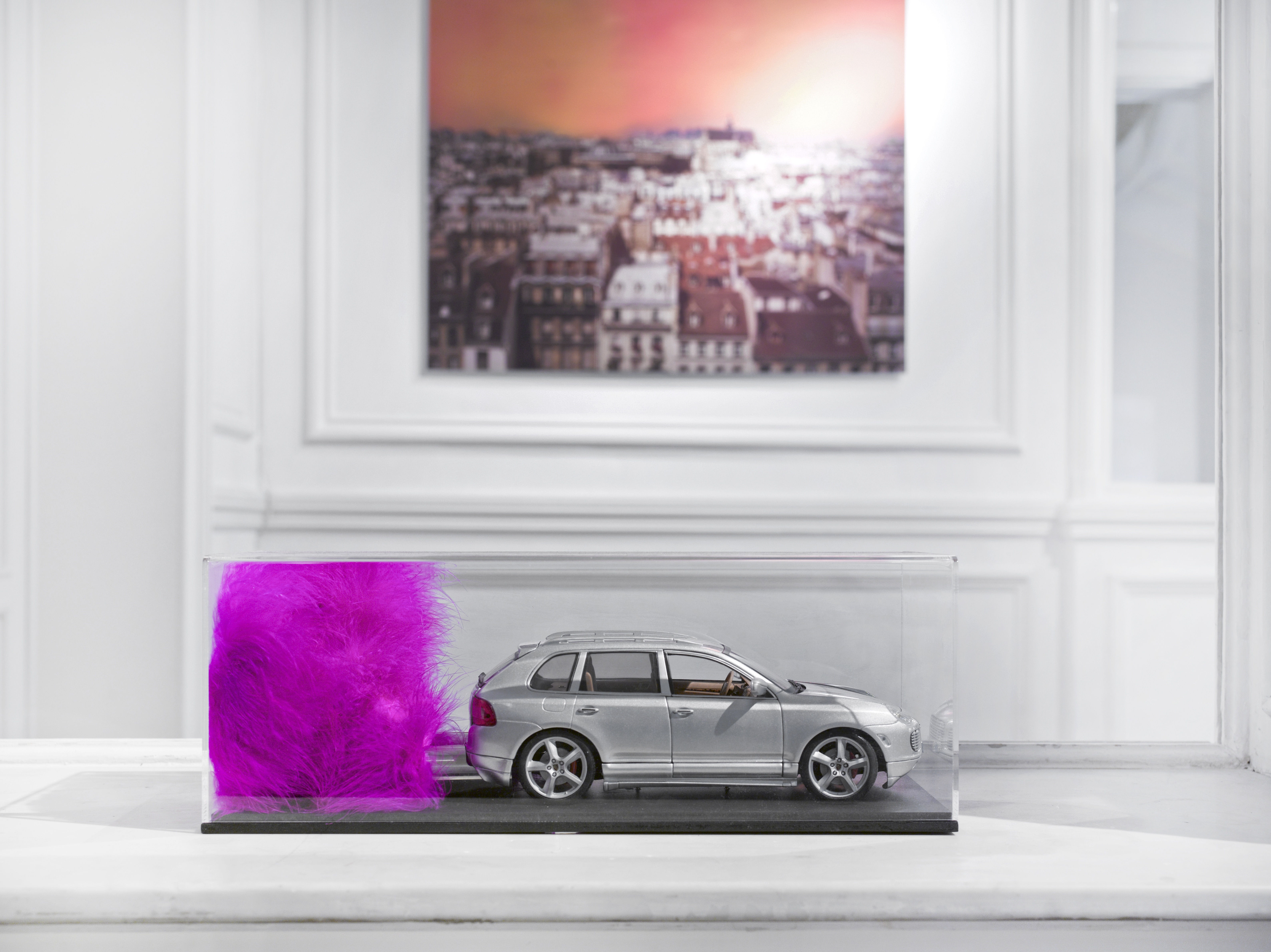 Naturally, every actor carries his or its own responsibility in this state of affairs. And although they defend against passing judgment on whomever, preferring the mise en scène (oftentimes humorous) to moralising, the HeHe pair don't miss targeting the current aberration of automobile traffic (particularly 4X4's) in city-centres (for that matter, HeHe is very active in projects to bring back alternative forms of public transport on the old Parisian intra mural railway line). The Porsche Cayenne, outsized, with its 189 grams per kilometre of CO2, is a perfect illustration. Launched in a miniature model producing a pink cloud through the streets of New York (Toy Emissions, 2007), and dressed up with a feather of the same colour (Porsche's Plume, 2011), it has nonetheless to take on competition from the Land Rover Discovery (269 g for the V6 Supercharged model), above all in its spatial variant (Beckham's one-way ticket to the moon edition, 2013)… And it isn't even necessary to drive a car in order to pollute. The simple fact of existing is sufficient: Million Parts (2008) converts the CO2 emitted by our human organism into modulated light within an enclosed space. "The set-up induces CO2 levels that surpass internationally accepted norms for enclosed spaces, indeed high enough for a last gasp!"
